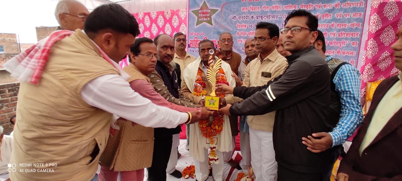 बसंत पंचमी के मौके पर साहित्य विकास समिति द्वारा कवि व साहित्यकारों को सम्मानित किया गया हास्य व्यंग के चित परिचित कवि साहित्यकार उमाशंकर को बिदकी साहित्य सम्मान तथा अनिल तिवारी निर्झर फतेहपुरी को साहित्य प्रतिभा सम्मान से सम्मानित किया गया
