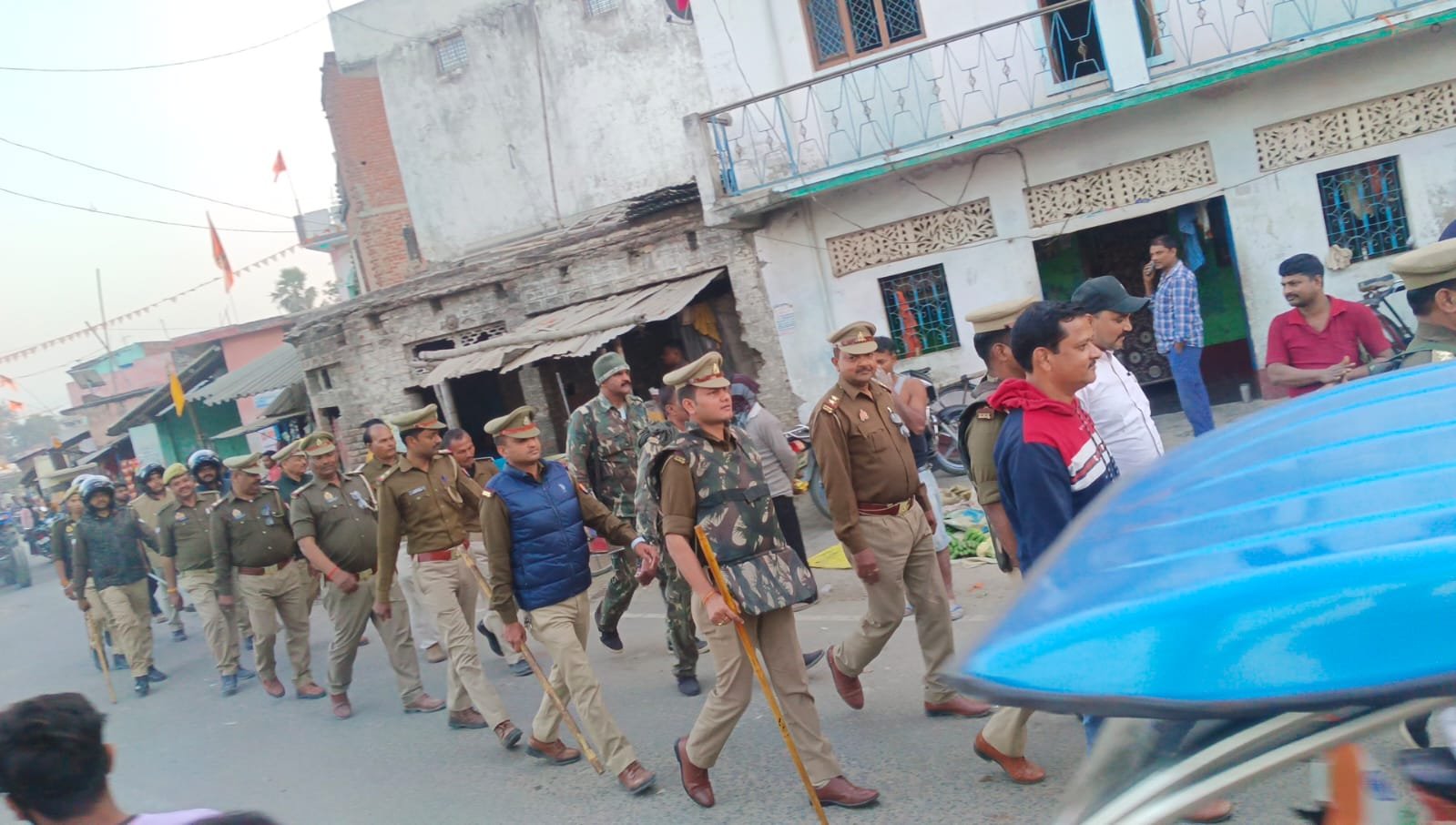 समउर पुलिस चौकी व बिहार पुलिसकर्मियों के द्वारा संयुक्त रूप से निकाला गया फ्लैग मार्च